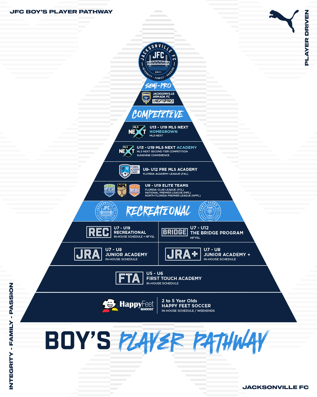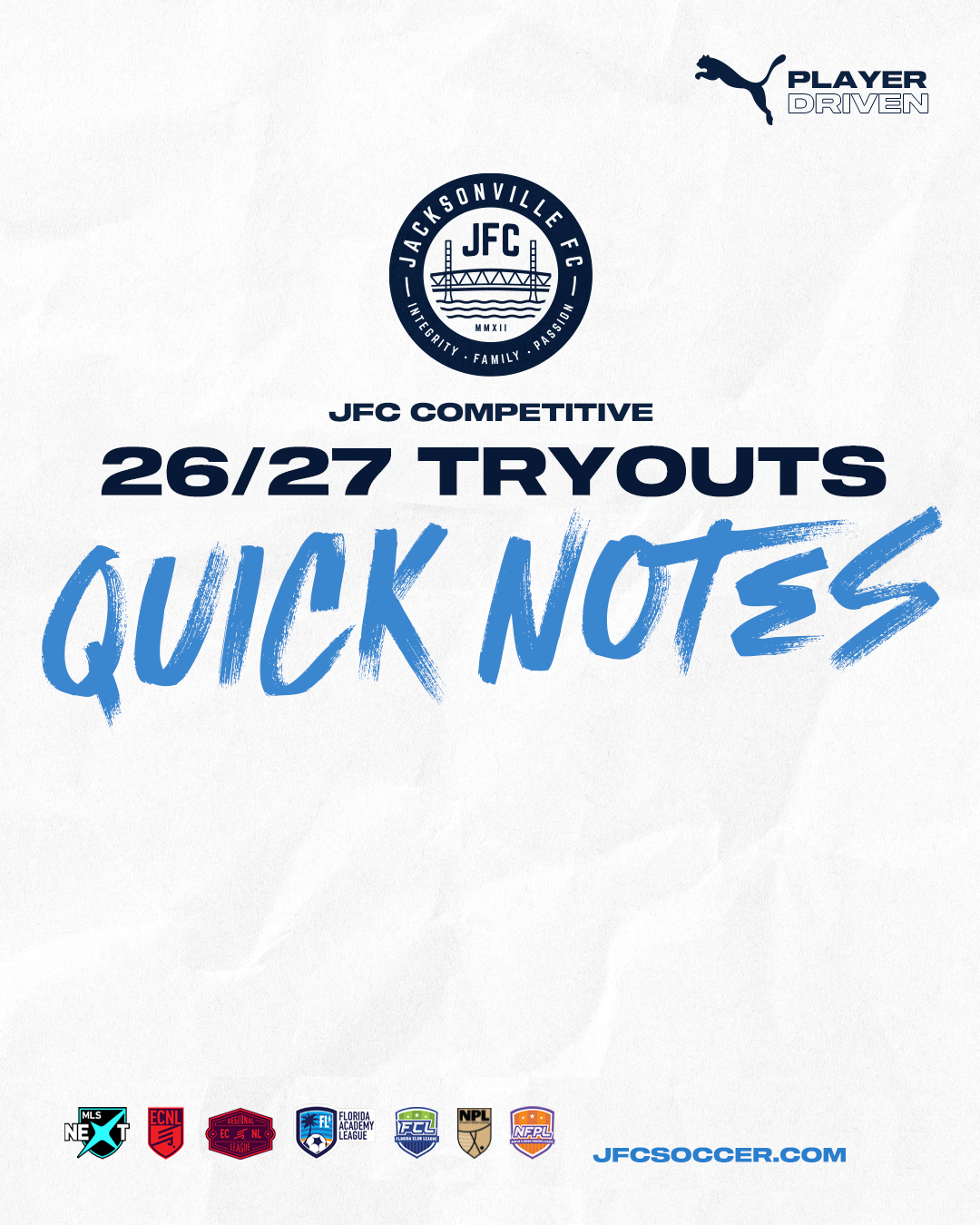 Jacksonville FC is pleased to announce its 2026/2027 Competitive Tryouts. Our Competitive Tryouts will allow players the opportunity to display their talents in front of our JFC Coaching Staff. The upcoming Competitive Tryouts will identify players for the 2026/2027 Season, beginning in August 2026. JFC Tryouts act as a player-identification and assessment opportunity for local talent interested in playing soccer at Jacksonville FC.