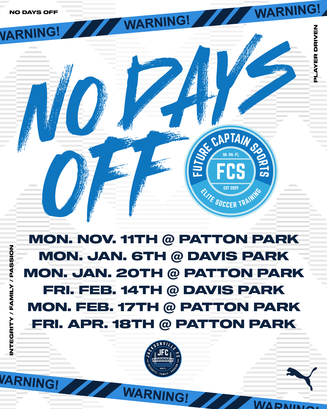 “No Days Off” presented by Future Captain Sports (FCS) and Jacksonville FC (JFC) is designed to focus on a player’s technical ability and tactical knowledge during opportunistic days off from school or holidays. FCS “No Days Off” will have a curriculum that focuses on certain technical components of the game as well as creating a fun competitive environment. Players will work on their technical skills while learning tactical and strategic insights while playing in game like competitions throughout the day.